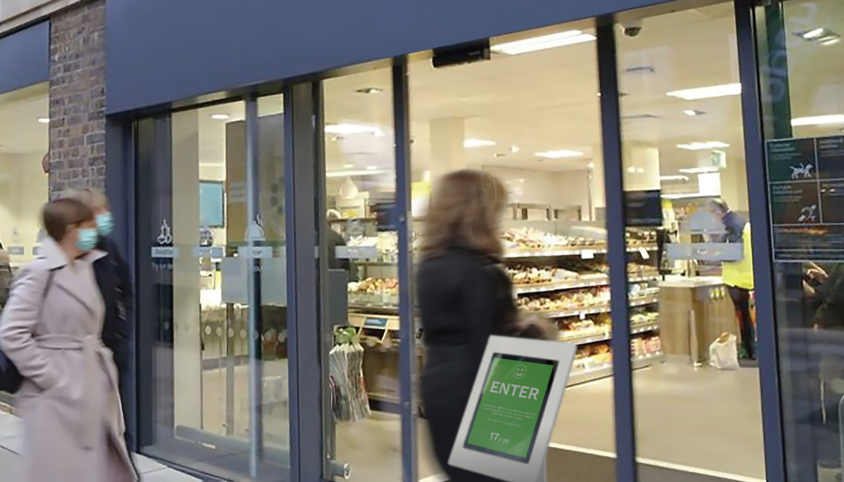 FootfallCam accurately counts how many customers are going in and out of your building, giving you real-time data on the number of customers inside – your occupancy. A tablet display at the entrance uses a simple traffic light system to inform customers whether they should enter, or whether the maximum occupancy has been reached and they should wait. When other customers exit, the screen will update accordingly. This allows efficient occupancy control for essential businesses such as supermarkets, drugstores, banks and hospitals.