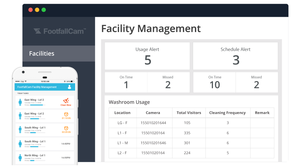 FootfallCam washroom management module enables users to identify which facilities are underutilized to plan allocation of maintenance staff and plan out their cleaning schedules. The cleaning schedules of staff are based on usage of facilities instead of a recurring predetermined time.