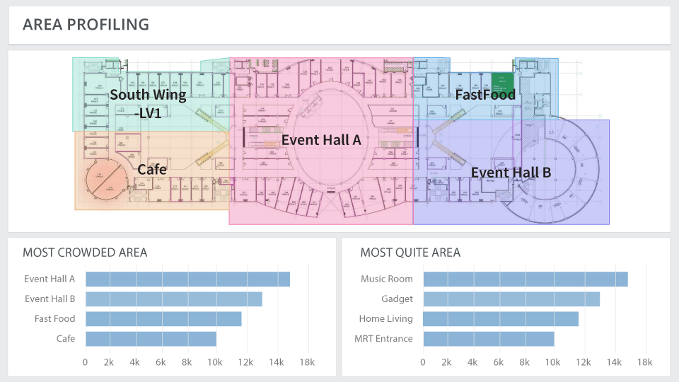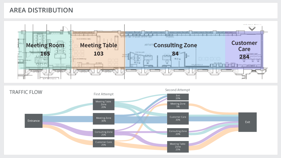 Using path counting to visualise the traffic flow of visitors to determine which pathways are often used to plan placements of advertisement displays and digital signages while traffic heatmap provides in-depth view into how engaged shoppers are to determine the effectiveness of those displays and signages.